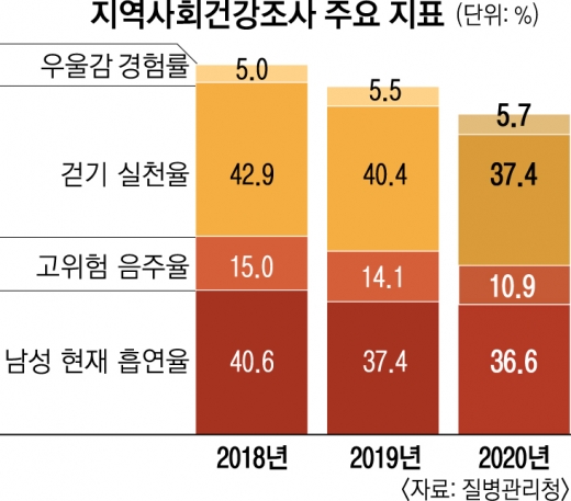 1년 넘게 우리 일상을 지배하고 있는 코로나19 이후 건강습관은 어떻게 달라졌을까. 한편으론 흡연과 음주가 줄어드는 긍정적인 효과도 있었지만 외부활동이 줄어들고 배달음식 소비는 늘면서 비만은 늘어났다. 특히 장기간 코로나19 상황으로 인한 경제적 어려움과 고립감으로 우울감을 느끼는 비중이 늘어나는 건 건강정책에 큰 도전이 되고 있다.