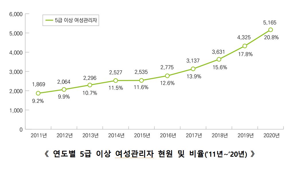 여성 공무원 비중이 40%를 넘어섰지만 5급 이상 관리자 현황만 놓고 보면 여전히 갈 길이 멀다는 지적이 나온다. 지난해 여성 관리자는 5165명으로 처음으로 5000명을 넘었다. 비율로는 20.8%로 처음으로 20%를 넘겼다. 2011년(1869)만 해도 9.2%에 불과했던 여성 관리자 비중은 2013년(10.7%) 처음으로 10%를 넘어섰지만 2016년까지도 12.6%로 증가세가 미미했다. 하지만 2017년 13.9% 이후 해마다 급증하면서 10년만에 2.7배 넘게 늘었다.