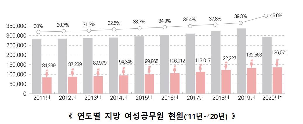 지방자치단체에서 일하는 여성 공무원 비율이 사상 처음으로 40%를 넘었다. 서울·부산 등 일부 지자체는 여성 공무원이 절반 이상을 차지했다. 이에 비해 여성 관리자는 최근 10년 사이에 두 배 넘게 늘었는데도 여전히 20%에 그쳤다.