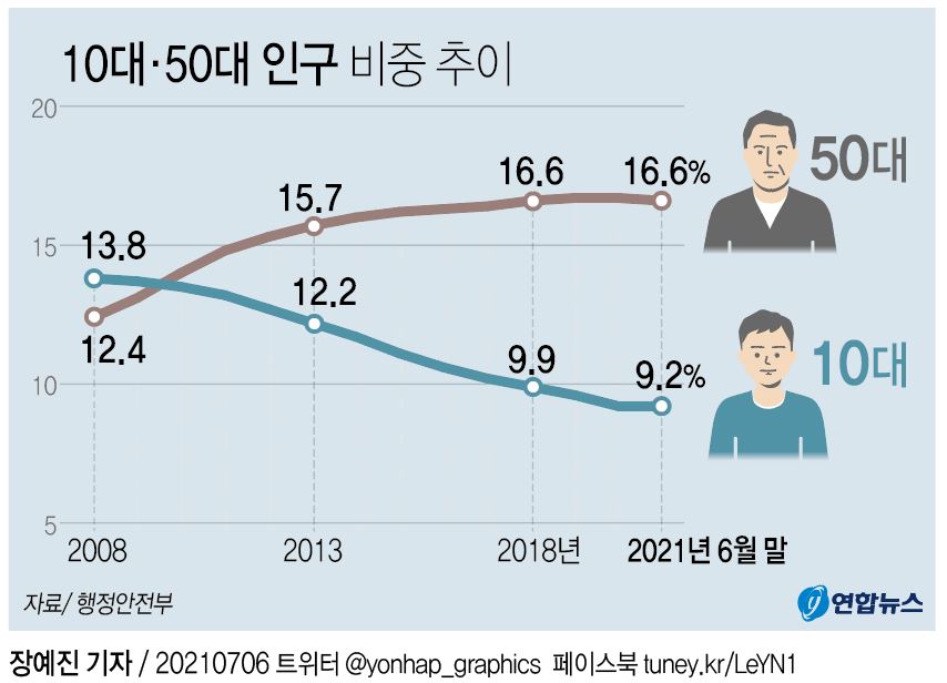 출산율이 감소하기 시작한 연령대인 20~30대는 26.2%에 그쳤다. 10대는 2008년 13.8%, 2013년 12.2%, 2018년 9.9%, 2021년 9.2%로 비중 갈수록 줄어들고 있다. 10대 이하는 16.6%로 50대와 비중이 같았다. 행안부는 저출산으로 인해 저연령층 인구비중이 감소하는 현재 추세가 계속되면 10년 뒤에는 50대 이상 인구가 전체 인구의 절반 이상을 차지할 것으로 예측했다.