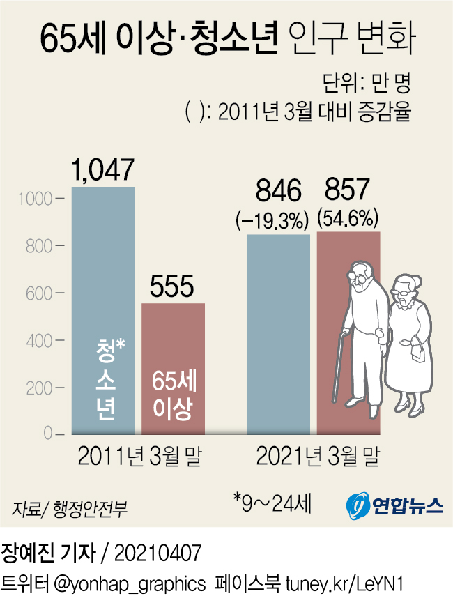 출산율이 감소하기 시작한 연령대인 20~30대는 26.2%에 그쳤다. 10대는 2008년 13.8%, 2013년 12.2%, 2018년 9.9%, 2021년 9.2%로 비중 갈수록 줄어들고 있다. 10대 이하는 16.6%로 50대와 비중이 같았다. 행안부는 저출산으로 인해 저연령층 인구비중이 감소하는 현재 추세가 계속되면 10년 뒤에는 50대 이상 인구가 전체 인구의 절반 이상을 차지할 것으로 예측했다.