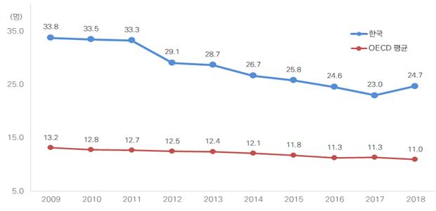 주목해야 할 게 하나 더 있다. 2018년 기준 우리나라 자살사망률은 인구 10만명당 24.7명이었다. OECD 1위다. 한국 자살사망률은 1995년만 해도 11.2명이었지만 외환위기 이후 급증하기 시작해 2000년 14.1명, 2005년 24.7명, 2011년 31.7명까지 치솟은 뒤 이후 조금씩 감소했지만 2018년 다시 증가했다. 그에 비해 OECD 평균은 2010년 12.8명 이후 꾸준히 감소해서 2018년 11.0명까지 줄었다.
