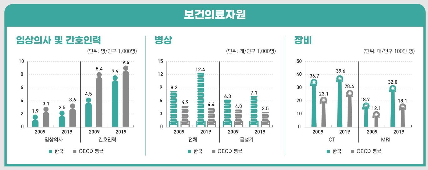 한국은 의료 장비는 많은데 정작 환자를 치료할 인력은 부족했다. 2019년 기준 임상 의사(한의사 포함)는 인구 1000명당 2.5명으로 폴란드·멕시코(2.4명)에 이어 OECD에서 가장 적은 규모였다. 오스트리아(5.3명)와 노르웨이(5.0명)는 한국보다 의사 규모가 두 배 이상이었고 OECD 평균도 3.6명이었다. 간호인력 역시 인구 1000명당 7.9명으로 OECD 평균(9.4명)보다 1.5명 적었고, 이 중 간호사는 인구 1000명당 4.2명으로 OECD 평균(7.9명)과 두 배 가까이 차이가 났다.