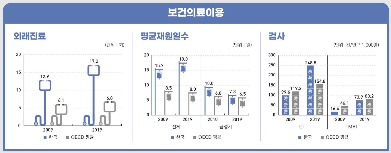 우리나라 국민 1명이 받은 외래 진료 횟수는 2019년 기준 17.2회로 OECD 국가 중 가장 많았다. OECD 평균(6.8회)과 비교하면 2.5배 수준이다. 입원환자 1인당 평균 재원일수 역시 2019년 기준 18.0일로 일본(27.3일) 다음으로 길었다. 전체 병상은 인구 1000명당 12.4개(2019년 기준)로 일본(12.8개)에 이어 두번째로 많았고 OECD 평균(4.4개)의 약 3배 수준이었다. 인구 100만명당 자기공명영상(MRI)과 컴퓨터단층촬영기(CT) 역시 각각 32.0대와 39.6대로 OECD 평균(MRI 18.1대·CT 28.4대)을 웃돌았다.