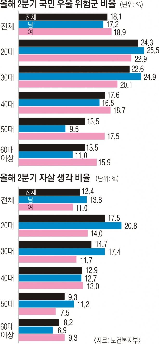 우울감은 자살을 생각하는 것으로 이어질 수 있어 특히 위험하다. 자살 생각 비율은 12.4%로 지난 3월 조사(16.3%)보다는 감소했지만 2019년(4.6%)과 비교하면 2.5배 수준이나 된다. 연령별로는 20대와 30대가 17.5%, 14.7%로 가장 높았고, 특히 20대 남성과 30대 남성이 각각 20.8%, 17.4%로 모든 성별·연령대 중 가장 높게 나타났다. 그다음은 20대 여성으로 14.0%였다.