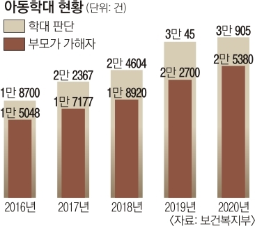 보건복지부가 31일 국회 보건복지위원회에 제출한 ‘2020 아동학대 연차보고서’에 따르면 지난해 아동학대로 최종 판정을 받은 사례는 3만 905건으로 2019년 3만 45건 대비 2.9% 늘었다. 이 가운데 학대 행위자가 부모인 경우가 2만 5380건으로 82.1%를 차지했다. 2019년(2만 2700건)과 비교하면 11.8% 늘었다. 초·중·고교 직원, 보육교직원, 아동복지시설 종사자가 가해자인 사례는 각각 882건, 634건, 556건이었다.