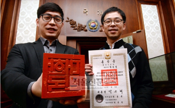 국새 찍기 달인들인 곽상혁 행정안전부 상훈담당관실 주무관과 김동훈 인사혁신처 심사임용과 주무관은 모두 서예를 전공했다. 지금도 임명장과 훈·포장은 이들이 손으로 직접 쓴 뒤 국새와 직인을 찍는다. 자연스레 서예 달인들이 국새 달인이 되는 셈이다. 김 주무관은 “처음 6개월은 국새를 잡은 손에 땀이 나서 미끄러지기 일쑤였지만 굳은살이 박인 후부터는 더 잘 찍게 됐다”며 웃었다. 6년간 국새를 잡아온 곽 주무관도 “손바닥에 물집이 잡힌 채로 1시간에 150장 넘게 훈포장에 국새 찍는 일을 한 적도 있다”면서 “물집 속에서 피가 나는 것도 참고 일하다 보면 굳은살이 생기더라”고 덧붙였다.