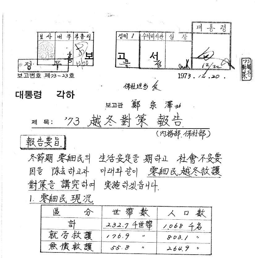 당시 월동대책 관련 문서에선 사회취약층과 관련한 내용을 비중있게 다루고 있다. 1966년 자료에는 “도시 실업 영세민 81만 4887만명, 수재민 3만 1695명, 노숙자 1만 3000명” 등 도시영세민 85만 9182명을 위한 양곡을 공급하는 춘궁기 대책을 수립하겠다고 돼 있다. 지금은 사라진 보릿고개 대책이 대통령에게 보고해야 할 정도로 중요한 현안이었던 가난한 저개발국의 모습이 잘 드러난다. 1973년 월동대책보고 문건에서도 “사회불안요인을 제거하고자 아래와 같이 영세민 월동구호대책을 강구하여 실시”한다고 강조했다.