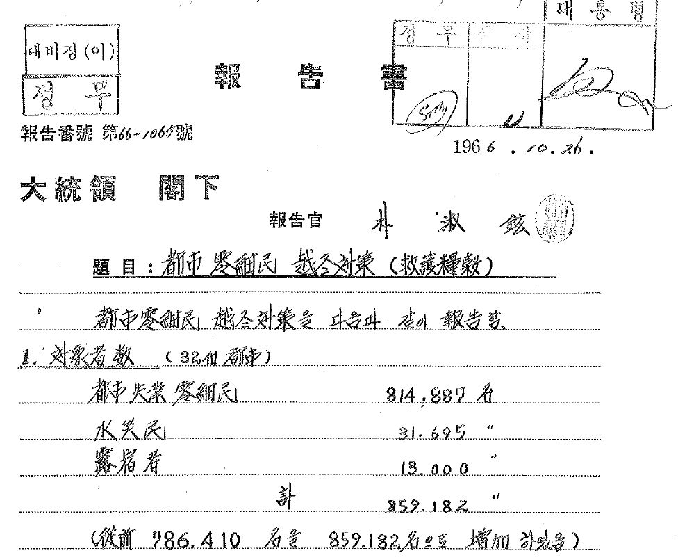 “영세민을 위한 양곡수급을 우선적으로 운송케 하여 시기를 놓치는 일이 없도록 함이 필요함.”(1966년, ‘도시 영세민 월동대책’)