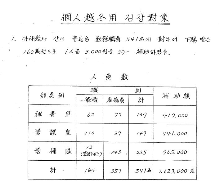 김장을 담그는 게 월동대책에서 차지하는 비중이 매우 컸다는 걸 보여주는 대목도 여러 차례 등장한다. 1964년 11월 대통령에게 보고한 청와대 월동준비 현황 문서에는 “청와대 근무직원 541명에 대하여 하사받은 160만원으로 1인당 3000원을 균일 보조”하였고, “5인 가족 김장 비용을 8000원으로 예상하고 부족액 5000원은 11월 및 12월의 활동비를 지급”해 “김장에 소요되는 금액을 충당“토록 했다. 1984년 보고서에는 청소대책을 언급하면서 “김장쓰레기는 당일 수거원칙을 수행하고 있음”이라고 밝혔다.