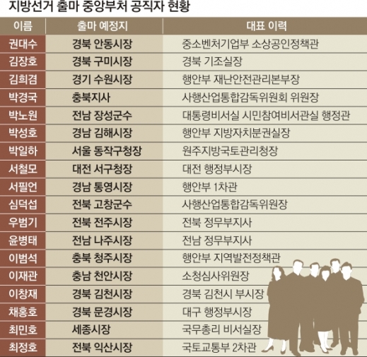 행안부는 고위공직자가 대거 지방선거에 나설 예정이다. 이재관 전 소청심사위원장은 충남 천안시장에, 서필언 전 행안부 차관은 경남 통영시장, 심덕섭 전 사행산업통합감독위원장은 전북 고창군수, 이범석 전 행안부 지역발전정책관은 충북 청주시장, 김희겸 전 행안부 재난안전관리본부장은 경기 수원시장, 박성호 전 행안부 지방자치분권실장은 경남 김해시장, 박노원 전 대통령비서실 시민참여비서관실 행정관은 전남 장성군수에 출마한다.