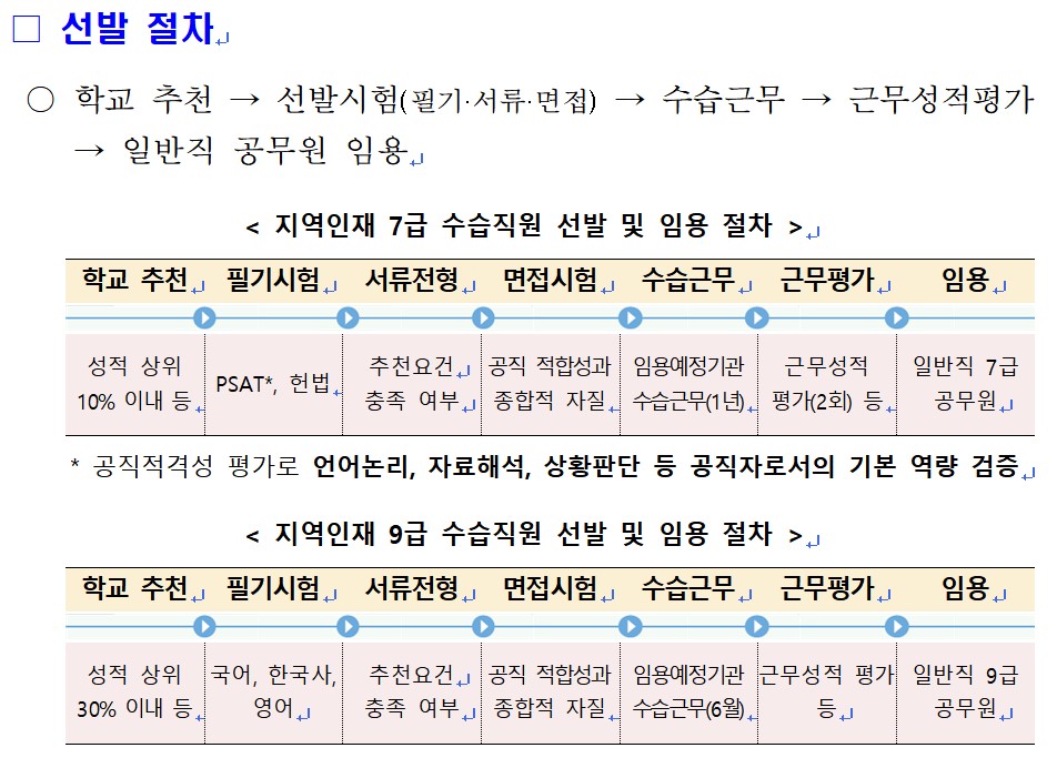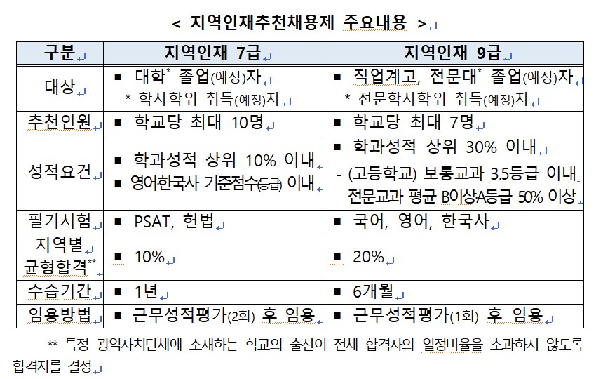 지역인재 7급은 4년제 대학 졸업(예정)자를 학교추천을 거쳐 선발해 1년간 수습근무 후 일반직 7급 공무원으로 임용하고, 지역인재 9급은 특성화·마이스터고 등 졸업(예정)자를 학교추천을 거쳐 선발해 6개월간 수습근무 후 일반직 9급 공무원으로 임용한다.