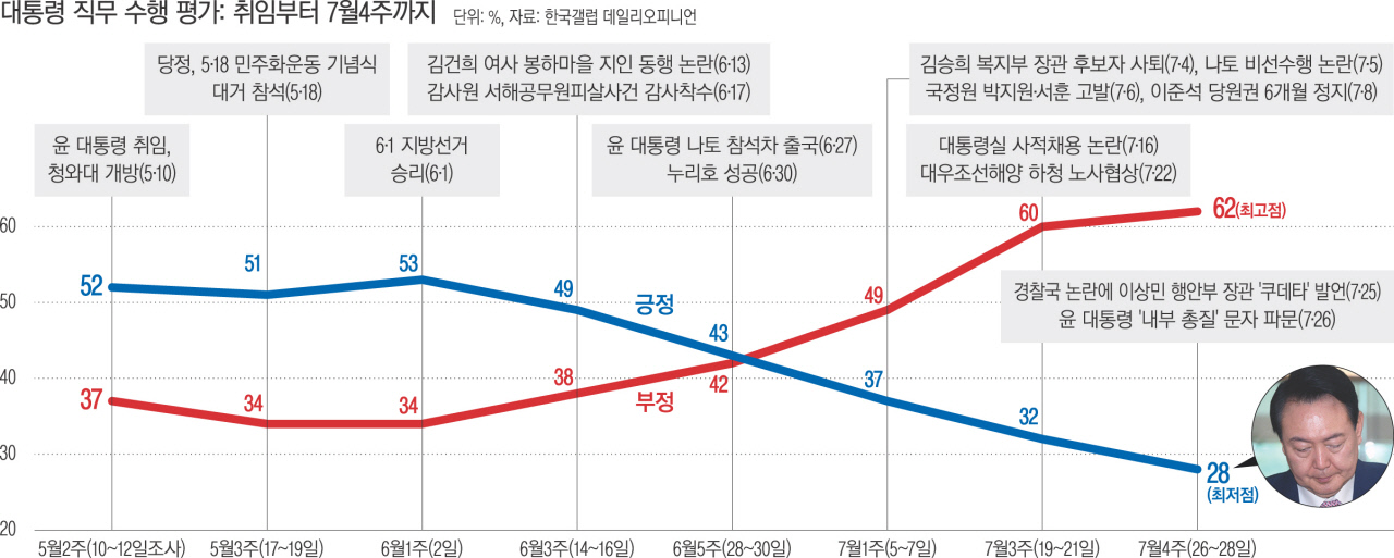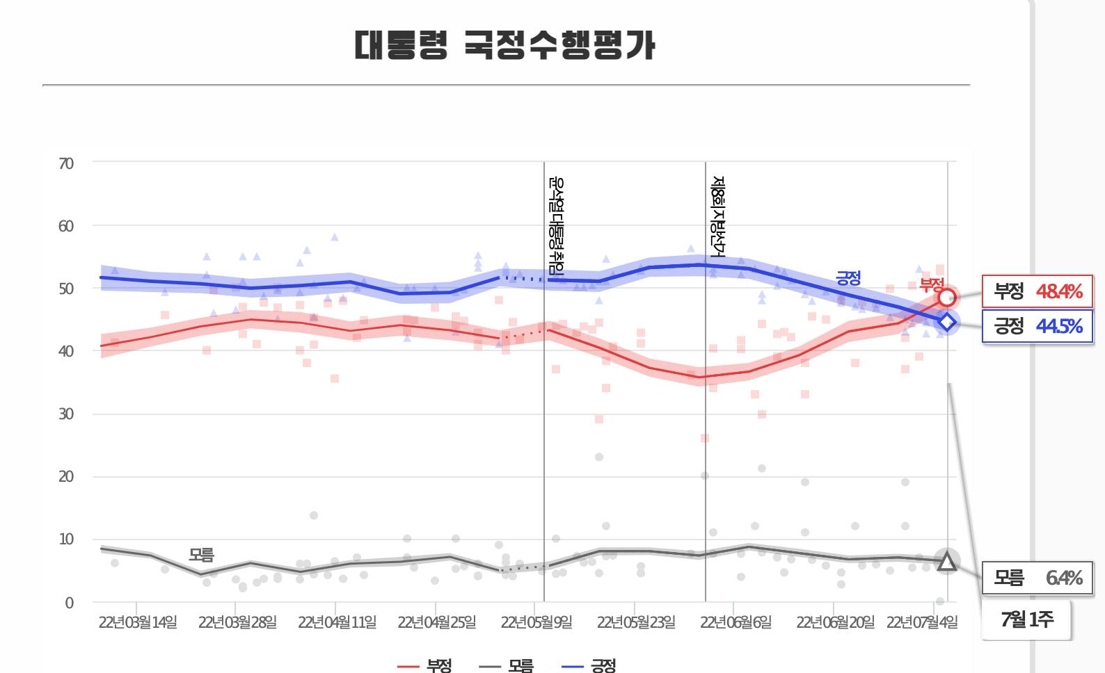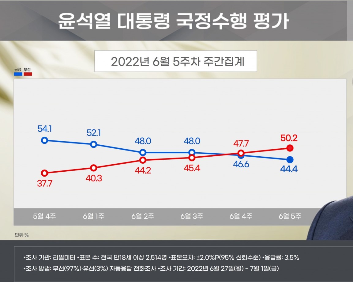 여론조사 전문업체 리얼미터가 20일∼24일 전국 성인 2515명에게 물은 결과(95% 신뢰수준 ±2.0%포인트), 윤석열이 ‘국정수행을 잘하고 있다’는 긍정 평가는 지난주 대비 1.4%포인트 하락한 46.6%, ‘국정수행을 못하고 있다’는 부정 평가는 지난주보다 2.3%포인트 상승한 47.7%.