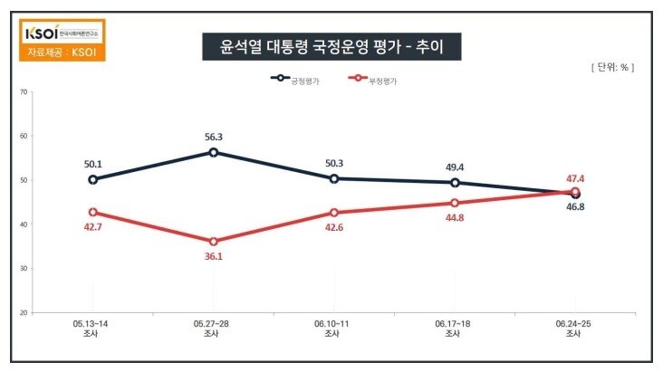 한국사회여론연구소(KSOI)가 티비에스(TBS) 의뢰로 24일∼25일 전국 성인 1001명을 대상으로 한 설문(95% 신뢰수준 ±3.1%포인트)에서는 부정 평가는 지난주보다 2.6% 포인트 상승한 47.4%, 긍정 평가는 지난주보다 2.6%포인트 하락한 46.8% 기록. 이 조사에서도 국정 수행 긍정 평가는 5월 4주차 때 56.3%를 기록한 이후, 50.3→49.4→47.4%로 연속 하락추세.