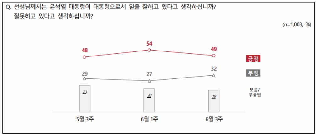 엠브레인퍼블릭, 케이스탯리서치, 코리아리서치, 한국리서치가 6월 13일부터 사흘 동안 성인남녀 1003명을 대상으로 진행한 전국지표조사(NBS)를 보니, 윤석열이 국정운영을 잘한다고 긍정 평가한 게 49%, 부정 평가는 32%였다. 6월 1주차에 비해 긍정은 5% 포인트 감소했고 부정은 5% 포인트 늘었다. 정부 주요 요직에 검찰 출신을 임명하는 문제는 '지나치게 검찰 출신에 편중됐다'고 답한 응답자가 51%였고, '능력과 자질에 따라 결정한 것'이라고 한 응답자는 43%였다.