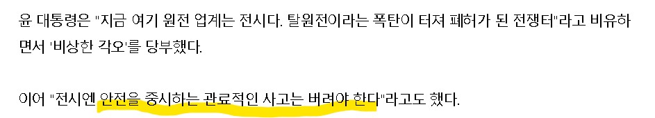 전시에 안전을 중시하는 건 죄악이다. 원전사고나면 나라가 망할 수 있다. 그래서 안전이 매우 매우 중요하다. 전시에는 원전 안전이 더 중요할 수밖에 없다. 그건 관료적인 사고가 아니라 국가의 의무다.