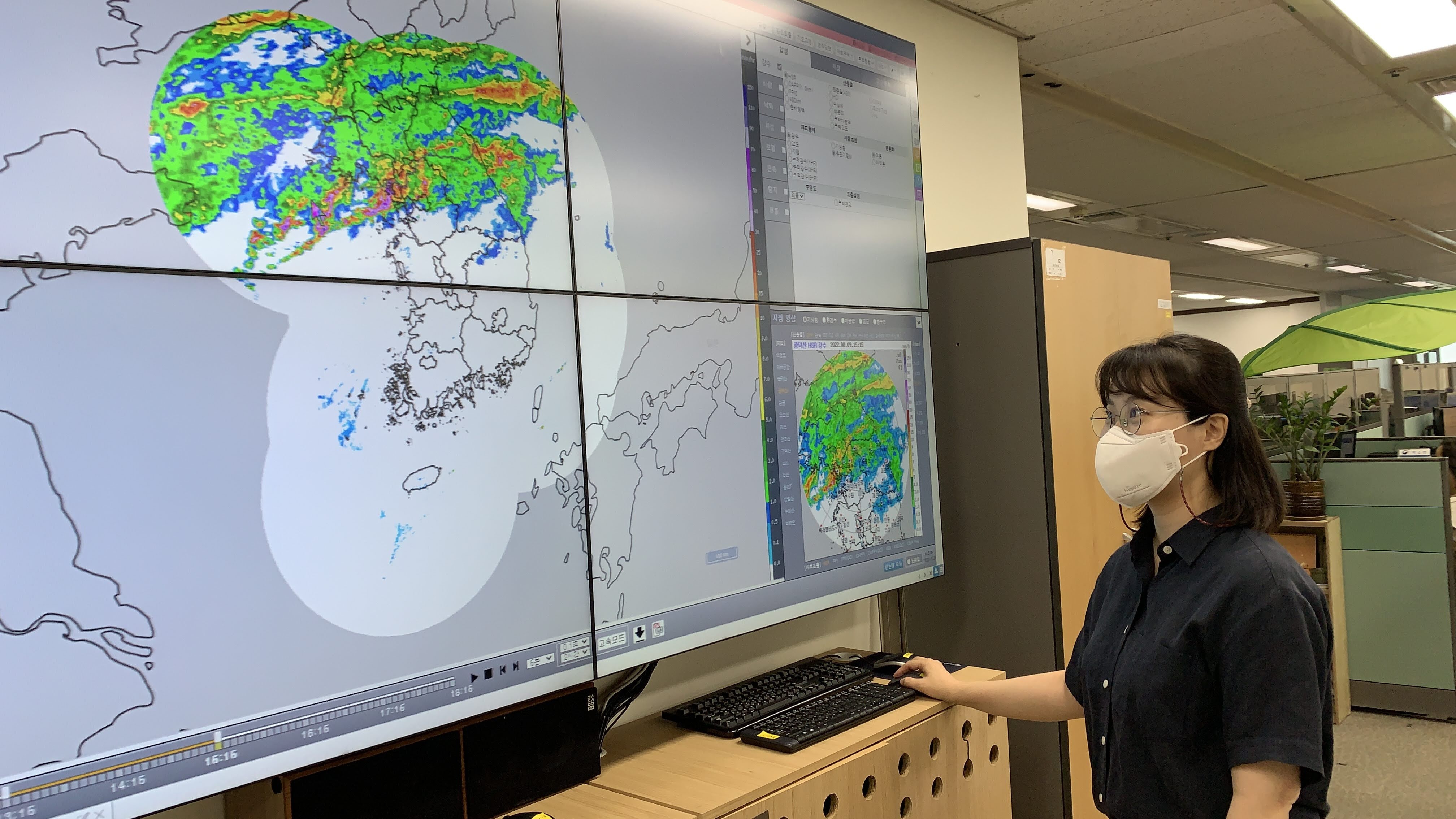 23일 권수현 기상청 기상레이더센터 기상연구사가 최근 집중호우 당시 기상레이더 관측 자료를 살펴보고 있다. 서울과 수도권을 중심으로 짙은 보라색 구름이 가늘고 짙게 표시된 걸 볼 수 있다. 초록색, 빨간색, 보라색으로 갈수록 시간당 강우량이 많다는 뜻이다.