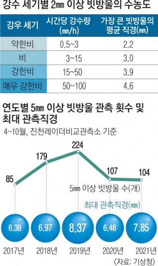 “빗방울 크기 자체가 예전보다 커졌다. 비가 한 번 내릴 때 더 많은 비가 내린다는 의미다. 열대까진 아니지만 소낙성 강우가 잦아졌다. 지름 5㎜가 넘는 빗방울을 관측한 횟수가 2014년엔 67회였는데 지난해엔 104회나 됐다. 최대 관측직경 역시 2014년에는 6.3㎜였는데 지난해엔 7.9㎜나 됐다.”