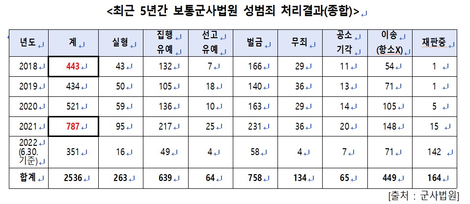 2일 국회 법제사법위원회 소속 더불어민주당 의원 김승원이 군사법원으로부터 제출받은 자료에 따르면 지난 2018년부터 올해 6월까지 현역군인을 대상으로 한 성범죄 재판은 모두 2536건으로 집계됐다. 연도별로 보면 성범죄 재판 건수는 2018년 443건, 2019년 434건, 2020년 521건, 2021년 787건으로 해마다 늘고 있다. 올해도 6월 말까지 351건이나 됐다. 이에 비해 실형을 선고한 건수는 2018년 43건, 2019년 50건, 2020년 59건, 2021년 95건에 그쳤다. 올해 상반기도 16건에 불과했다.