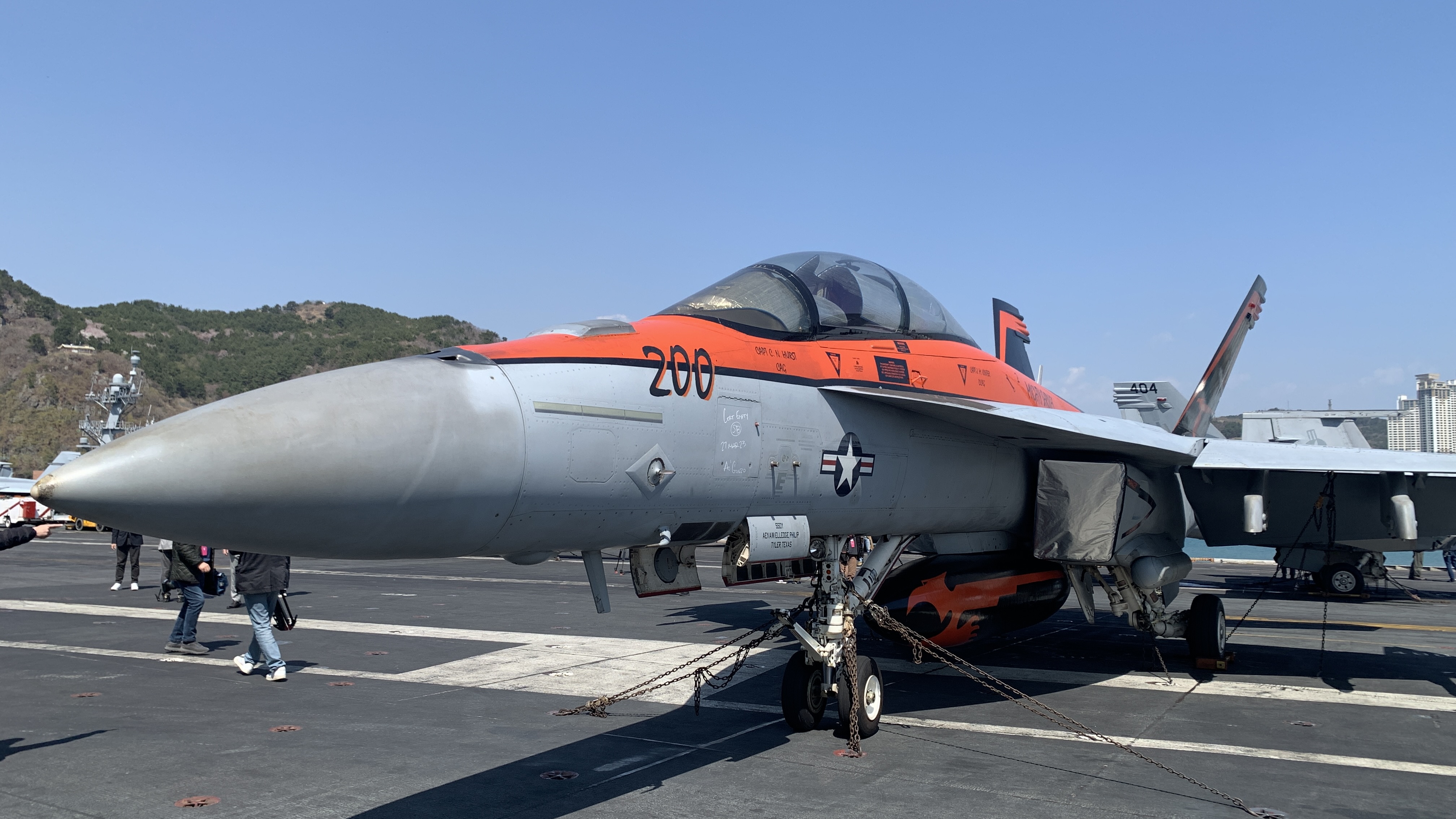 기자회견에는 스위니를 비롯해 니미츠함 함장 크레이그 시콜라, 주한미해군 사령관 마크 셰이퍼(준장), 한국 해군작전사령부 해양작전본부장 김지훈(준장) 등이 배석했다. 이들은 모두 제복을 깔끔하게 차려입었다. 역시 해군은 제복으로 승부하는구나 싶은 말쑥한 모습은 기자회견장 뒷편 함교 벽에 잔뜩 묻은 까만 그을음과 묘한 대비를 이뤘다. 해군 관계자는 “함재기가 하루에도 수십번씩 이착륙하다보니 그을음이 생기는 것”이라고 귀띔했다.