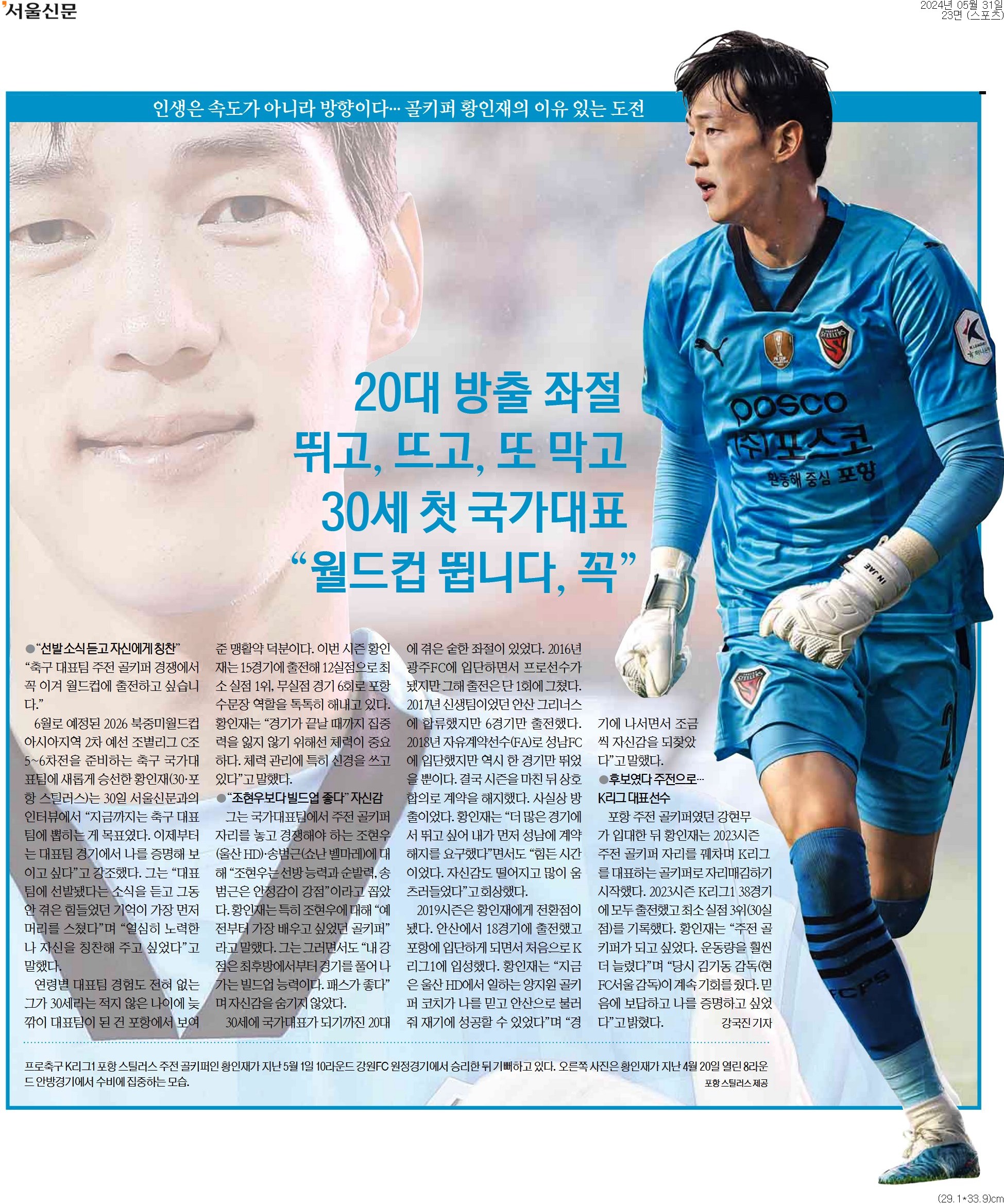 6월로 예정된 2026 북중미 월드컵 아시아지역 2차 예선 조별리그 C조 5∼6차전을 준비하는 축구 국가대표팀에 새롭게 승선한 7명 중에서도 가장 눈길을 끄는 선수가 황인재(포항 스틸러스)다. 그동안 연령별 대표팀 경험도 전혀 없고 30세로 적지 않은 나이인데도 이번 시즌 포항 돌풍을 이끄는 활약에 힘입어 늦깎이 국가대표가 됐다.