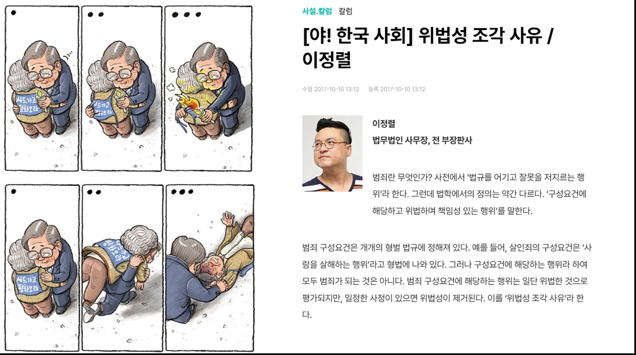 권범철이 지금도 잊지 못하는 게 사드기지를 둘러싼 만평이다. 항의전화가 쏟아져서 하루 종일 회사에 있을 수가 없을 정도였다. 며칠 뒤에는 이정렬(전 부장판사)이 <위법성 조각 사유>라는 칼럼까지 한겨레에 실었다. “표현의 자유는 민주주의의 기초에 해당하는 것으로 충분히 보장되어야 한다. 그러나 이는 법령이나 판례에서 보듯 ‘진실한’ 사실에 기반을 두어야 한다. 허위사실인 때에는 위법성 조각 사유에 해당하지 않는다. 명백히 위법한 행위이다.” 이 칼럼은 한겨레 시사만평 화백 권범철의 표현의 자유를 심각하게 훼손했다.('위법성 조각 사유'라는 칼럼이 다시 생각났다. 처음 봤을 당시에도 그렇고 지금 다시 봐도 일관성있게 끔찍하다.)