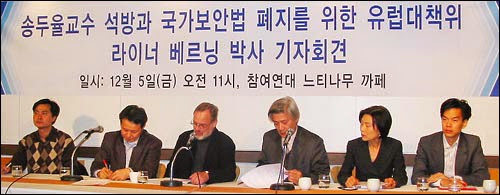 송두율 교수 석방과 국가보안법 폐지를 위한 유럽대책위의 위임을 받아 지난 1일 방한한 라이너 베르닝 박사(독일 한국협회 의장)는 5일 오전 서울 안국동 느티나무 카페에서 기자회견을 열고 "2001년 12월 김대중 전 대통령은 노벨평화상을 받았는데 김대중과 같은 주제를 고민하고 실천한 송두율 교수는 구속되었다는 데 경악을 금치 못한다"고 밝혔다. 자신과 송 교수의 관계를 "학문적 동지"로 표현한 라이너 박사는 기자회견 내내 "충격"과 "경악"이라는 표현을 수차례 써 송 교수 구속을 바라보는 시각의 단면을 나타냈다.