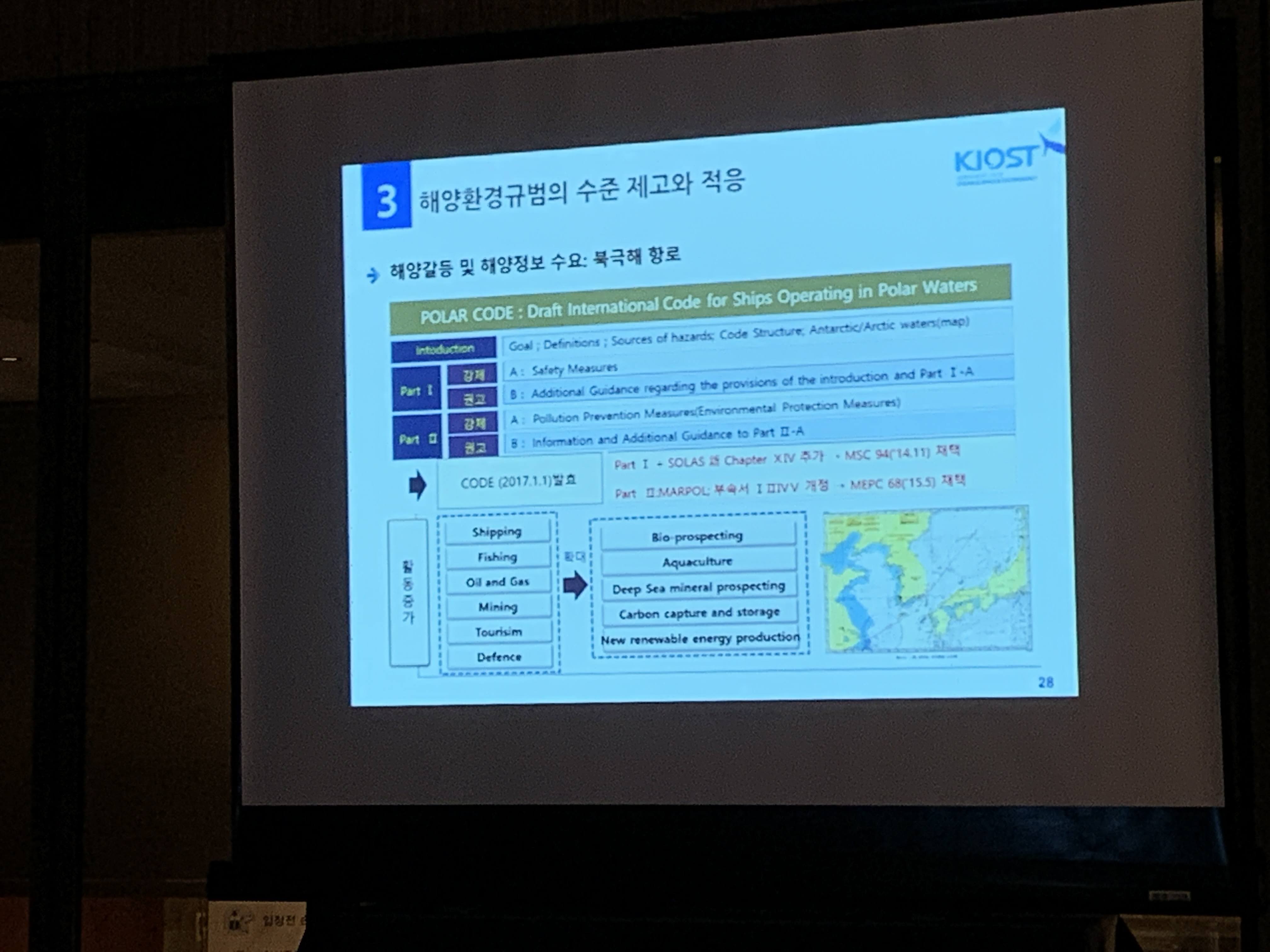 중요성이 갈수록 커지는 문제는 북극항로라고 할 수 있다. 양 소장은 “북극항로 자체의 경제적 가치는 아직은 기대에 모자라지만 향후 중요성을 고려하면 많은 연구가 필요하다”고 말했다. 그는 “다만 바다 자체는 열릴지 모르지만 국제법적으로 보면 북극항로가 닫히고 있다는 관점도 가능하다”고 밝혔다. 그는 “2015년에 체결되고 올해 발효된 중앙북극해 비규제 공해어업의 금지 협정에도 주목해야 한다”고 덧붙였다.