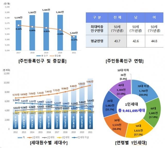 1인 가구가 급격히 늘어나는 것도 눈여겨볼 대목이다. 주민등록 가구는 2347만 2895가구로 전년 대비 1.6% 증가했다. 이 가운데 1인 가구가 946만 1695가구(40.3%)로 사상 처음 40%를 돌파했다. 특히 연령별로 70대 이상 18.6%(175만 9790가구), 60대 17.8%(168만 5226가구), 50대 17.1%(162만 825가구) 순이었다.
