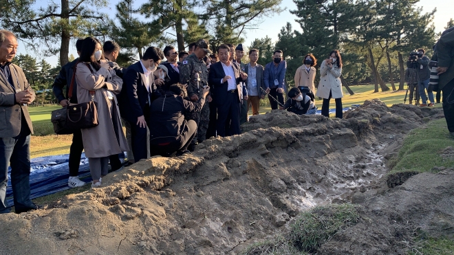 더 큰 문제는 따로 있었다. 12일 국회 국방위원회 소속 더불어민주당 의원들이 현장을 찾았다. 합동참모본부에선 당초 “영내 골프장 페어웨이에 떨어졌다”고 했지만 실상은 많이 달랐다. 탄두 추락 현장에는 길이 15m, 폭 1.5m, 깊이 1m 가량 파인 웅덩이가 보였다. 이 여단장은 “탄두가 수평으로 미끄러져 떨어졌다”고 설명했다. 탄두 추락 장소에서 300m 떨어진 곳에는 병사들이 생활하는 생활관과 종교시설이 있었다.