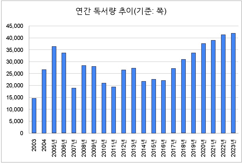 2023년 한 해 동안 책 100권을 읽었다. 2005년 120권 이후 가장 많이 읽었다. 쪽수로 보면 4만 1891쪽인데, 2005년에 3만 6353쪽이었으니까 독서기록을 작성한 이래 최고기록이라고 할 만하다. 월평균으로는 8.3권, 3491쪽이다. 2022년에는 99권을 읽어서 월평균 8.3권, 3443쪽이었던 것과 비교하면 미세하게 더 ‘실적’이 좋다고 해야겠다.