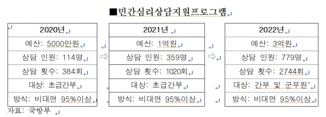 ‘민간 심리상담지원 프로그램’은 군 간부와 군무원이 카카오톡에 개설된 심리상담 채널을 통해 신청하면 심리검사를 한 뒤 ‘위험군’을 대상으로 심리상담을 진행하는 방식이다. 처음 시작한 2020년에는 초급간부 대상이었다. 연간 이용자 114명(384회)이었지만 2021년에는 이용자 359명(1020회)로 늘었다. 2022년부터는 모든 간부와 군무원 대상으로 확대하면서 이용자가 779명(2744회)으로 급증했다.