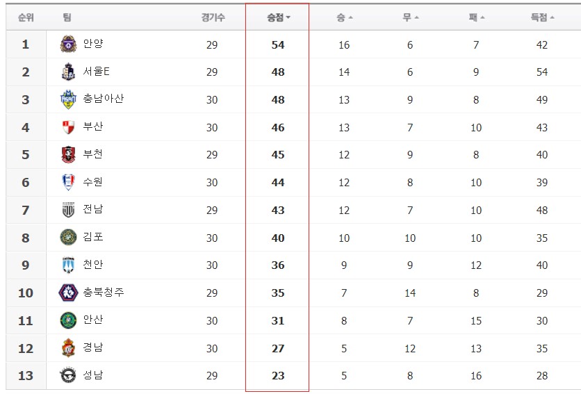 26일 K리그2는 FC안양이 우위를 차지한 가운데 서울이랜드가 뒤쫓는 양상이다. 안양은 지난 5월 이후 선두 자리를 지켜왔지만 지난 24일 열린 31라운드에서 서울이랜드에게 1-0으로 패하면서 승점차가 6점으로 좁혀졌다. 현재 1위 안양은 승점 54점, 2위 서울이랜드는 승점 48점이다.